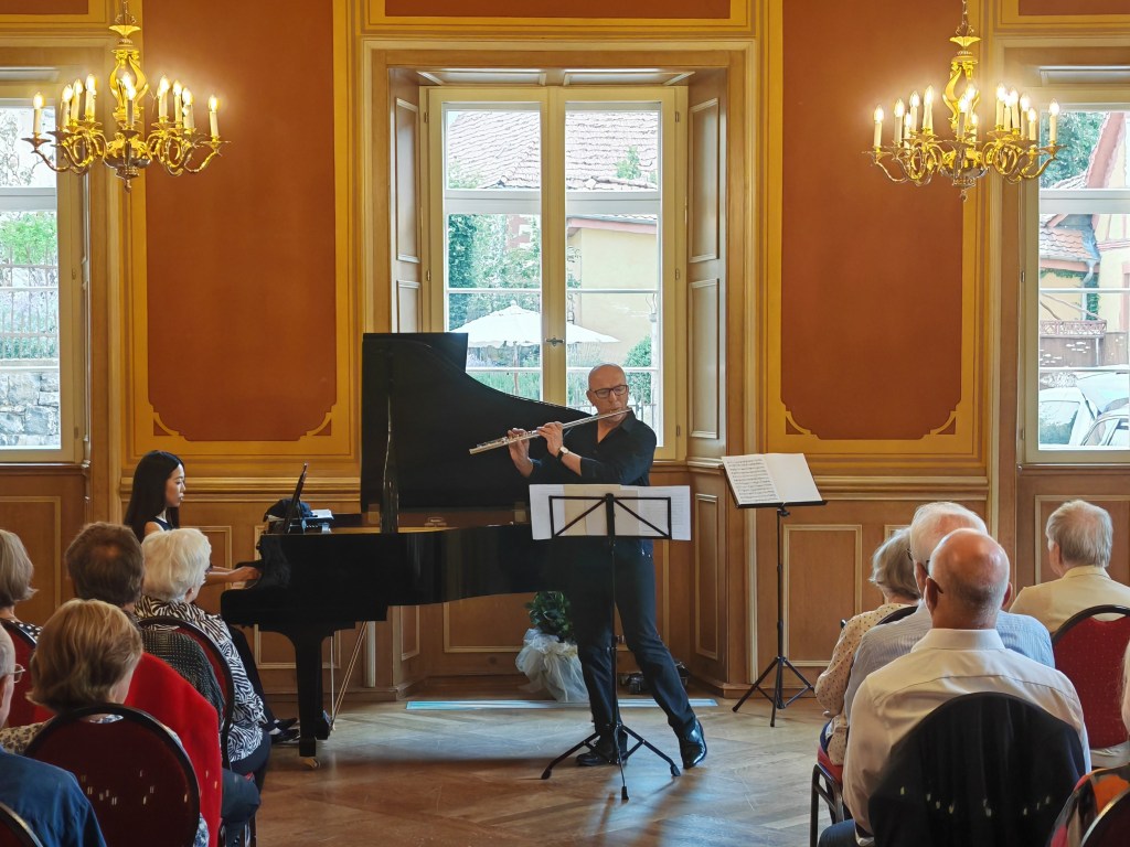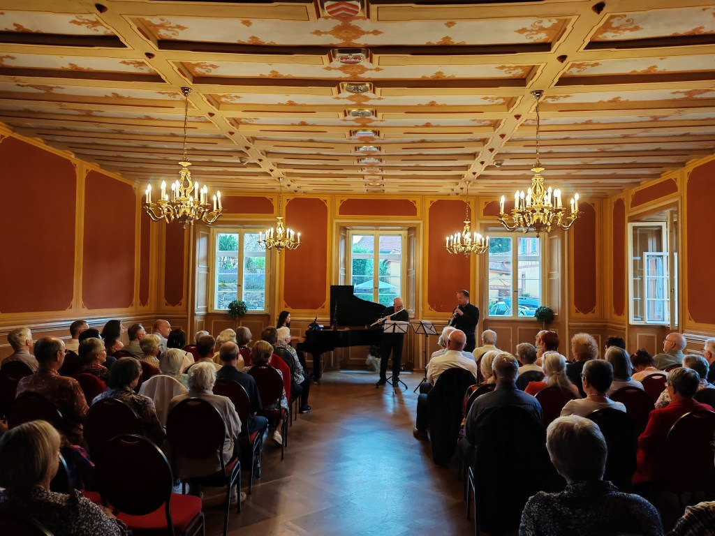 Gedern (mü). Mit stehendem Beifall hat das Publikum im Wappensaal des Gederner Schlosses das Konzert des Trios 150 während der Gederner Kulturtage gefeiert. Der Gederner Chorleiter Volker Bilz hatte den Kontakt zu dem Trio hergestellt, dem mit seinem Sohn, dem Oboisten Manuel Bilz, der Solo-Oboist im Sinfonieorchester des Westdeutschen Rundfunks ist, und dem Querflötisten Dirk Peppel zwei exzellente Musiker mit Gederner Wurzeln angehören.